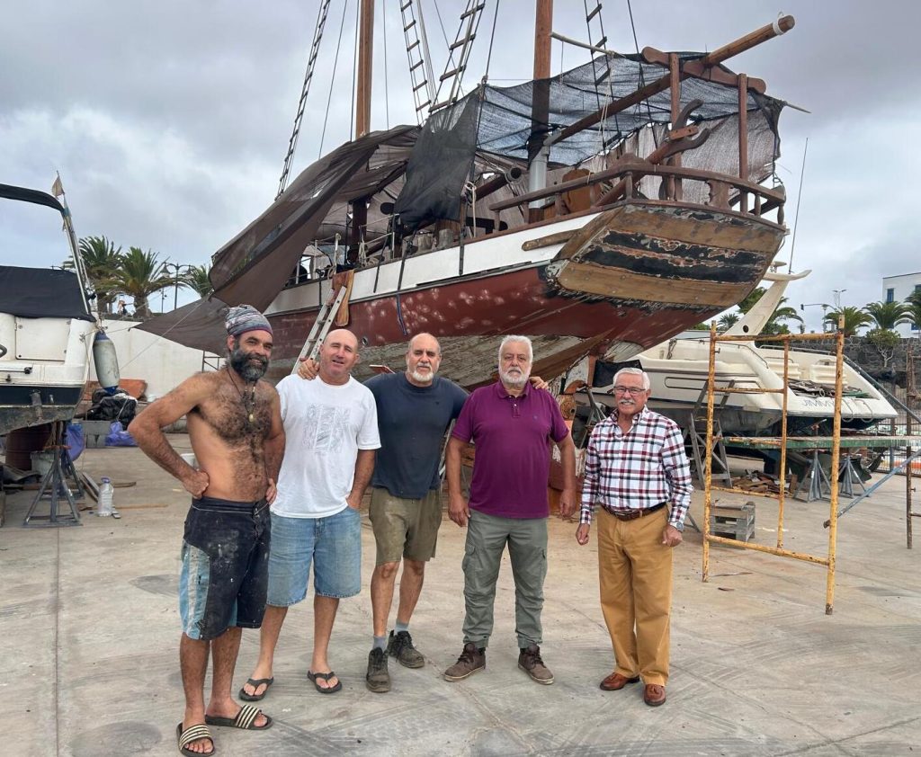 El velero de dos mástiles es una auténtica leyenda del mar. Fue sacado a subasta por Puertos Canarios el año pasado y adquirido por Justin KusevicNiz (el primero a la izquierda), un apasionado del mar que se está empleando a fondo en la puesta a punto de su nuevo barco, destinado a chárter clásico en aguas del sur de Lanzarote.
